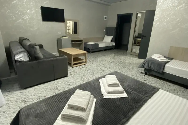 Размещение: 2-3х местные стандартные и 5-ти местные семейные номера. В номере двуспальная кровать, шкаф, стулья, прикроватные тумбочки, зеркало, телевизор, холодильник, кондиционер, Wi-Fi, санузел, балкон.